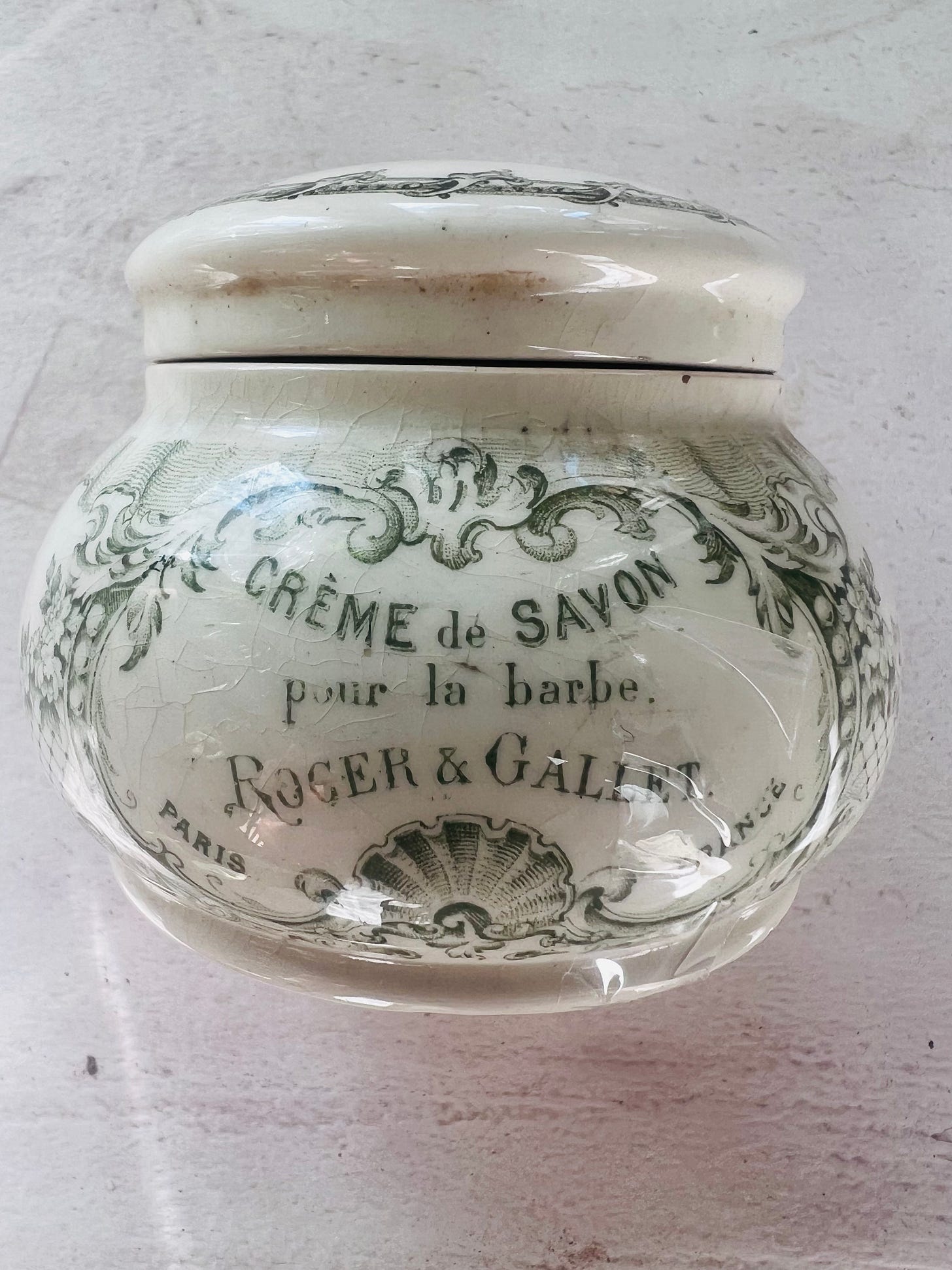 I found a late 1800 French porcelain pot in an Amsterdam charity shop that has now come back with me to France. It was made by Roger & Gallet who at the time exported widely from France, and this refillable shaving cream pot would have been found on fine dressing tables across Europe and as far as the US.